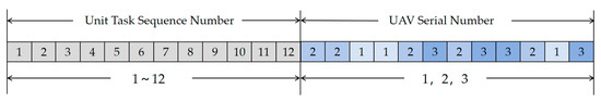 Step 1: Population coding: The length of the chromosome is equal to the number of unit tasks, with the first half used to mark the sequence numbers of the tasks and the second half representing the UAV’s serial number that directly constitutes the chromosome. To ensure the effectiveness and rationality of task assignment, we introduce three constraints: Constraint (9) ensures that each UAV is assigned at least one task; Constraint (10) ensures that each task is executed by only one UAV; Constraint (11) maintains the flow balance throughout the entire task assignment process, ensuring that the amount of tasks assigned to each UAV matches its execution capability. As illustrated in Figure 4, in the case of 12 unit tasks being carried out by 3 UAVs, each UAV will perform tasks, and each unit task can only be assigned to one UAV. Specifically, UAV number 1 is responsible for unit tasks numbered 3, 4, and 11; UAV number 2 is responsible for unit tasks numbered 1, 2, 5, 7, and 10; UAV number 3 is responsible for unit tasks numbered 6, 8, 9, and 12.