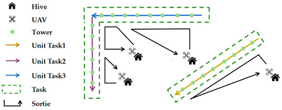 The problem of multi-UAV cooperative inspections and task assignment can be described as follows: For the inspection task composed of multiple transmission towers in multiple transmission lines in three-dimensional space, multi-UAVs can maximize the cooperative operation efficiency of UAVs through reasonable task segmentation, balanced distribution, and path planning. In the execution of the task, the UAV needs to take off from the designated charging station (hive) and return to the hive after the completion of the task. There are a certain number of redundant hives for the UAV to charge. Because the transmission towers in different lines belong to different entrusting parties, there are various types of inspection tasks in the scenario. The inspection task defines a number of checkpoints and auxiliary points for each tower. The UAV needs to hover at the checkpoint to take photos and complete operations such as turning at the auxiliary point. Figure 1 shows a scenario example with three transmission lines, two power change hives, and a total of 51 towers to be inspected.