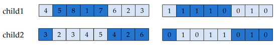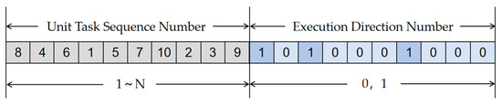 1. Population coding: The chromosome uses a two-part integer encoding strategy, and its length is set to twice the number of tasks assigned by the UAV. The first half of the code consists of a sequential sequence of natural numbers that define the execution order of the task unit in the flight table. The second half of the code adopts an independent 0, 1 binary format, which is used to specify the execution direction of the unit task, and the chromosome structure is shown in Figure 6.