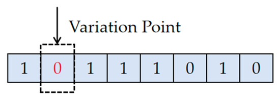 6. Population variation: In the variation process of ordering encoding, the inversion mutation operator is applied. Two encoding positions are randomly selected based on a preset probability, and their positions are swapped, as shown in Figure 12. For directional encoding, each encoding position undergoes possible mutations independently and with the same probability, as shown in Figure 13.