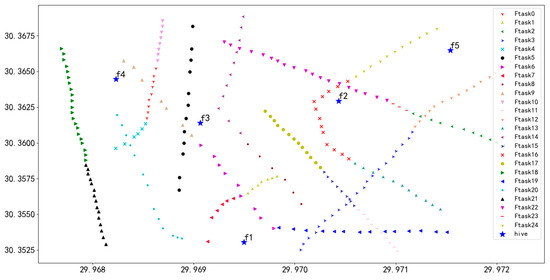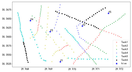 The experimental data were collected from a power grid scene in Zhejiang Province, China, whose geographical location was 30.3525–30.3675° N and 119.967–119.973° E. As shown in Figure 14, the grid scenario includes 11 transmission lines, 284 transmission towers, five UAV power-changing hives, and six task packages from different clients. Each node in the diagram corresponds to a tower or a power-changing hive with a clear latitude and longitude identifier, and the different colors of the nodes map the specific tasks covered by each task package.