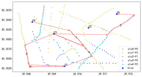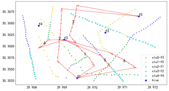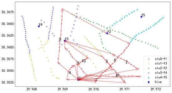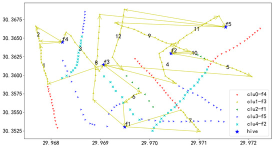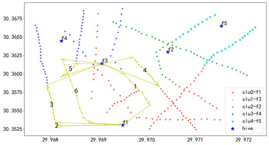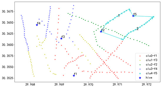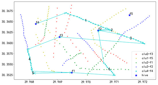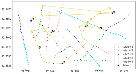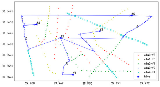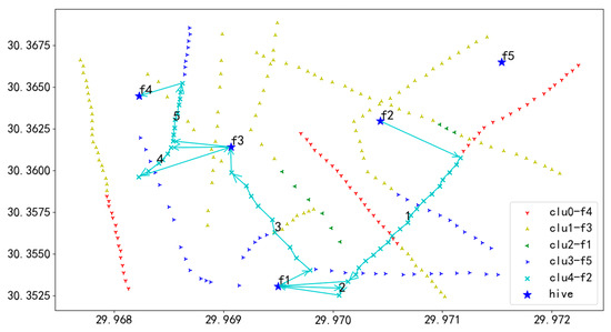 In Figure 30, UAV U4 takes off from hive f5, first inspects the towers on the route marked as 1, then returns to f4 for battery swapping, and continues the inspection in the order of 1 to 5, finally landing at hive f1.