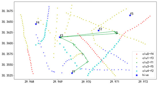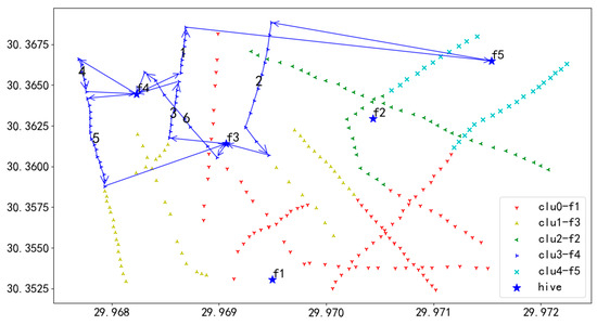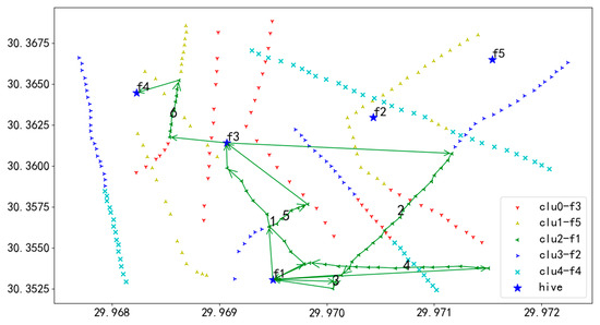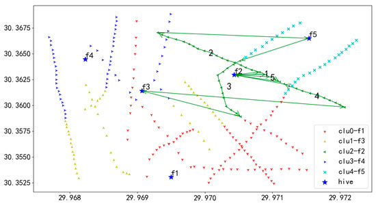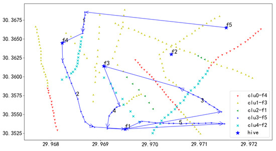In Figure 31, UAV U5 takes off from hive f2, first inspects the towers on the route marked as 1, then returns to f1 for battery swapping, and continues the inspection in the order of 1 to 5, finally landing at hive f4.