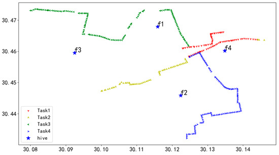 In Figure 38, UAV U4 takes off from hive f2, first inspects the towers on the route marked as 1, then returns to f2 for battery swapping, and continues the inspection in the order of 1 to 4, finally landing at hive f1.