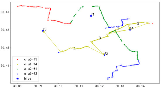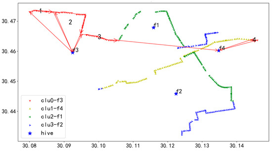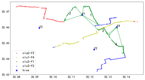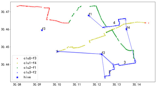 In Figure 37, UAV U3 takes off from hive f1, first inspects the towers on the route marked as 1, then returns to f1 for battery swapping, and continues the inspection in the order of 1 to 4, finally landing at hive f4.