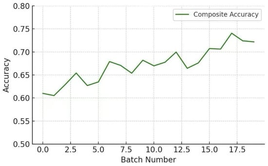 Composite accuracy across 20 evaluation batches. The steady increase highlights the effectiveness of dynamic weighting.