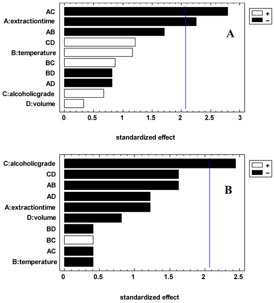 24 factorial design. Pareto diagram for total chromatographic area (A) and number of compounds detected (B).