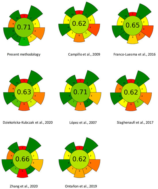 In the case of the present methodology, this global score was 0.71, equal to that reported by López et al. [12] using HS-SPME-GC- pFPD for the determination of DES and DMDS in wines (Figure 2). Both methodologies are characterized by the use of low sample volumes, no hazardous materials, no solvents, and low energy consumption. The lowest global scores were obtained by Campillo et al. [1], Ontañón et al. [19], and Slaghenaufi et al. [13], with analytical methodologies characterized by higher waste volumes, lower hourly sample throughputs, and/or a higher degree of complexity of the detection system.The aspect that received the lowest score for all of the methodologies was that related to the offline collection and determination, since the samples require transportation from the distillation point or the winery to the laboratory to be analyzed by GC.