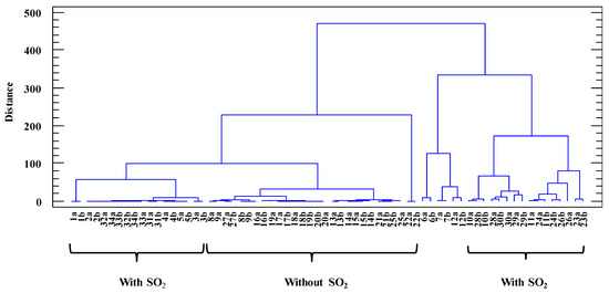 In order to evaluate the similarity among all of the samples, taking into account the content of volatile sulphur compounds considered in the present work, the data were subjected to a Cluster Analysis (CA) considering the squared Euclidean distance as a metric and the Ward method as an amalgamation rule. As can be seen in Figure 3, the samples seem to be grouped according to the use of sulphur dioxide, with three groups: one of them with distillates without SO2 and aged in wood, and two others with SO2. Guerrero-Chanivet et al. [31] found that the addition of sulphur dioxide during alcoholic fermentation had the higher influence on the aromatic and phenolic profile of distillates obtained using different distillation methods and aged for 14 and 28 months in oak wood. In the present study, samples 25, 27, 29, and 31 correspond to samples 24, 26, 28, and 30, respectively, after different periods of aging in wood. Out of all of them, 26, 28, and 30 were obtained from wines subjected to the addition of SO2. As can be observed in Table A2, in general, all of the volatile sulphur compounds were found to be decreased in the aged samples compared to unaged ones. In this sense, Zhou et al. [32] found that the content of sulphur volatile compounds together with alcohols, aldehydes, and terpenes decreased with aging time in different brandy samples. In this sense, De La Burgade et al. [33] found that dimethyl sulphide increased in Shiraz wines during accelerated bottle aging and that those increases were higher when more impermeable closures were employed, suggesting that its formation depends on the redox status of the wine. The same behaviour was observed for dimethyl disulphide by Jiménez-Lorenzo et al. [34] in a Viognier wine subjected to darkness under anoxic conditions for 9 weeks at a temperature of 50 °C. During aging in wood, the evolution of the redox potential depends on several factors: the amount of dissolved oxygen at the beginning of aging; the level of oxygen permeability through the wood; the amounts of compounds (phenolic compounds and volatile compounds, mainly) released from the wood; the temperature; and the rate of oxygen consumption [35]. According to this, all of these factors could determine the content of volatile sulphur compounds in distillates during their aging in wood.