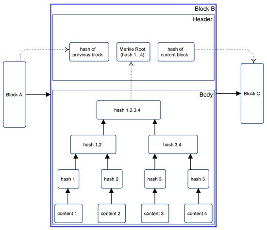 The features of blockchain technology are a result of how it functions. In the blockchain-based data storage model, data records (also known as transactions) from various sources are continuously grouped into blocks with a specific structure. The general structure of these blocks is illustrated in Figure 1. Each block contains a certain number of data records or transactions in its body, and each record is associated with a hash value.