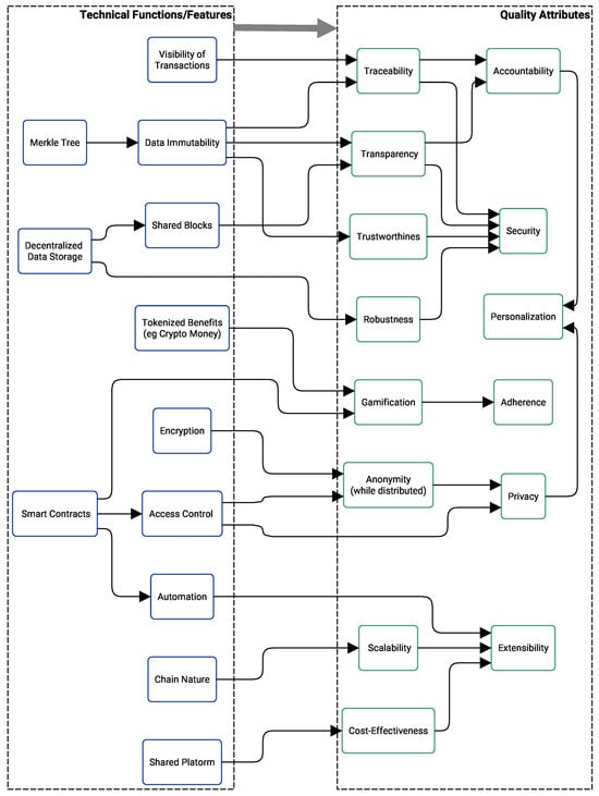 The reviewed studies have utilized blockchain technology in different ways to achieve various benefits. Here, we discuss the key features and quality attributes achieved through these applications. A summary of this discussion is provided in Table 5. Furthermore, the relationship of blockchain features or functions with those quality attributes is visualize in Figure 4.