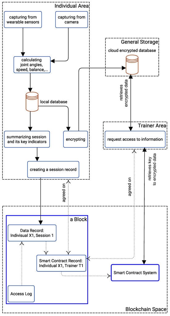 Scalability is supported through a blockchain’s capability to manage large volumes of data from multiple participants without performance degradation. As the number of participants and data points grows, the blockchain network can accommodate the increase effectively, ensuring smooth and consistent performance. Personalization is facilitated by using data collected over time to create tailored training programs for gross motor skill development for individuals, thereby enhancing motor development outcomes. A blockchain ensures that participants’ data remains secure while enabling trainers to make adjustments based on individual progress.