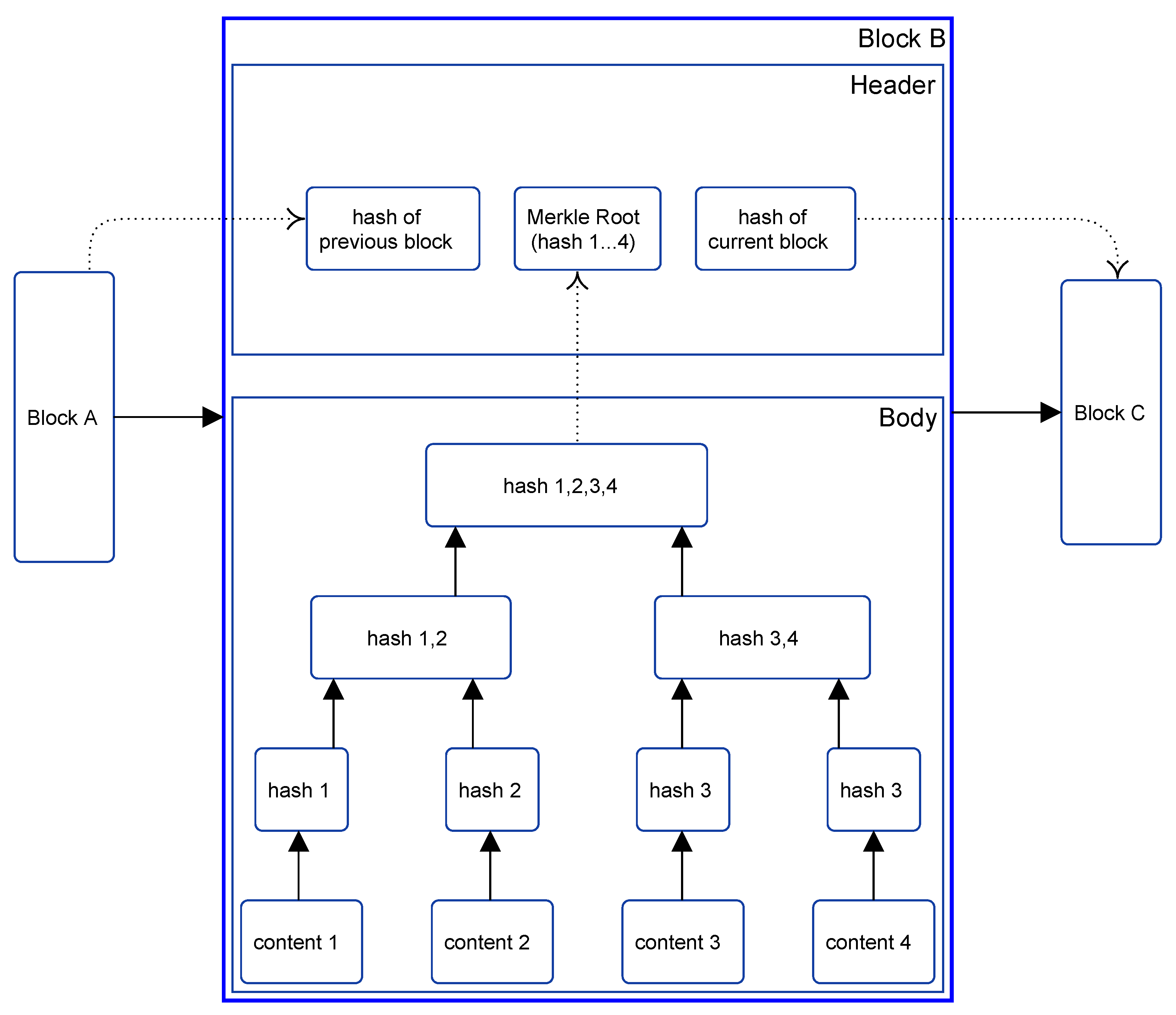 In blockchain technology, this concept is extended by linking blocks together through the inclusion of the root hash value from each block in the subsequent block. This creates a chain where the last block contains a hash value that represents all previous contents in the chain. As a result, any attempt to tamper with the contents of any block will invalidate the final hash value, ensuring the security and integrity of the blockchain.