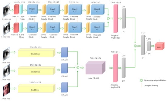 The MSMI-Net architecture, as shown in Figure 1, comprises two independent streams designed to enhance gaze estimation performance by comprehensively processing eye and face images. The eye image stream uses left and right eye images as input, while the fusion stream combines the left and right eye images with the full face image, totaling five input channels. To enhance the comparison with benchmark models and adapt to the smaller eye image size in the dataset, all inputs are cropped to 96 × 96. In the eye image stream, the input images first pass through a convolutional layer with a kernel size of 4 and a stride of 2, followed by normalization. The images then enter a ConvNext module [36] consisting of four stages, where the ConvNext Block is configured as [3,3,27,3], with the channel dimension gradually expanded from 128 to 1024. Downsampling operations are applied before each stage to reduce the feature map size, thereby constructing a deep CNN specifically designed for high-dimensional feature extraction from the eye region. Meanwhile, the fusion stream adopts a lightweight convolutional structure to efficiently extract low-dimensional features from both the eyes and the face, while avoiding excessive computational overhead. This stream utilizes a 5-layer 3 × 3 convolutional network to gradually increase the feature channel dimension from 3 to 256, and introduces residual connections during feature extraction to preserve the original eye feature information, thereby enhancing the impact of local features on gaze estimation. Additionally, two max-pooling operations are incorporated into the five convolutional layers to adapt to input image size variations while improving the model’s robustness to features at different scales. Given the varying importance of eye and facial images in gaze estimation tasks, MSMI-Net designs an AWAM to dynamically optimize the fusion weights of the eye and facial features. Furthermore, the improved convolutional block attention module (CBAM) [37] employs parallel spatial and channel attention mechanisms to achieve feature compression, information interaction, and weight adaptive adjustment, thereby enhancing the fusion of eye and facial features. Finally, the high-dimensional features extracted by the eye stream are combined with the features after integration from the fusion stream and processed through two fully connected layers to complete the gaze estimation task.