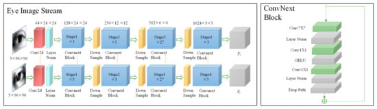 In the ConvNext network, inspired by the downsampling design of the Swin Transformer, the Down Sample module introduces grouped convolution and effectively reduces the spatial size of feature maps using a 2 × 2 convolution with a stride of 2. This design optimizes computational efficiency and enhances model stability and performance by incorporating Layer Normalization (LN). This approach is particularly crucial for gaze estimation tasks, as it expands the receptive field while reducing computational overhead, enabling better capture of key features in eye images. The independent downsampling module not only decreases computational complexity but also enhances the model’s generalization ability to complex visual scenes, thereby improving the accuracy and robustness of gaze estimation.