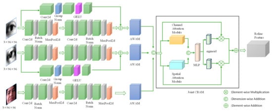 After the AWAM, we concatenate the eye and face features along the dimension and feed the concatenated features into the JointCBAM for more effective feature fusion. The traditional CBAM module evaluates attention weights on the channel dimension first, then adjusts the weights on the spatial dimension through concatenation. However, the improved JointCBAM module proposed in this study processes the input features in parallel by dividing them into two parallel branches, which handle channel and spatial attention separately. Finally, the attention information from both branches is interacted with to achieve more efficient feature fusion. As shown in Figure 5, in the compression part, the input features are divided into two branches, with max pooling and average pooling used to obtain channel descriptors and spatial descriptors, respectively. In the interaction part, the channel and spatial descriptors are concatenated and processed by a multi-layer perceptron (MLP) to model the correlation between global spatial and global channel features. After sufficient interaction between the global spatial and channel features, they are split and restored to their original dimensions. The weights are calculated using a sigmoid function and applied to the input features. Finally, the weighted features are fused through element-wise summation. Compared to the traditional CBAM module, the JointCBAM module not only avoids separately analyzing the spatial and channel modeling process but also effectively merges channel attention and spatial attention information to achieve better space-channel interaction and generate more comprehensive features. To validate the effectiveness of our improved module, we conducted related comparative experiments in Section 4.