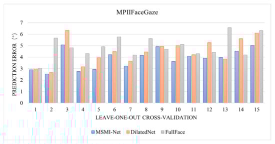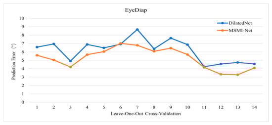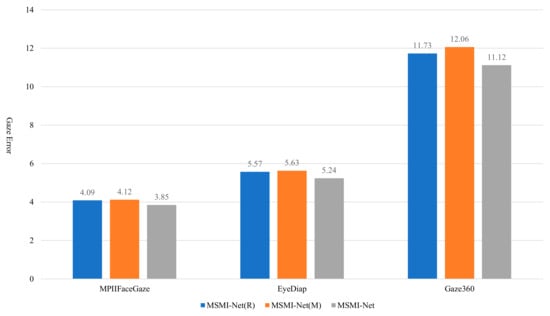 Baseline: In this experiment, to validate the rationality and effectiveness of our model design, we selected the Dilated-Net [41] gaze estimation model, proposed in previous research, as the baseline for performance comparison. Dilated-Net effectively enhances the ability to capture appearance features by introducing dilated convolutions and a multi-region network design, thereby improving gaze estimation accuracy based on appearance. The model performs especially well when handling small angular changes. Additionally, Dilated-Net shares the same input data composition as the MSMI-Net proposed in this study, using left and right eye images along with facial images as input features. Therefore, performing a performance comparison under the same input conditions ensures fairness in the experiment and allows for a more accurate assessment of the improvements made by MSMI-Net in feature fusion and information extraction. As a model that achieves good performance in existing research, Dilated-Net is highly representative. Its network structure shares similarities with MSMI-Net but also contains key design differences. Thus, selecting Dilated-Net as the baseline model not only provides an effective performance comparison but also enables a deeper analysis of the advantages and improvements of MSMI-Net in feature representation, information fusion, and angular adaptability.