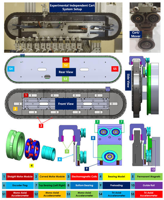 Independent cart technology addresses these challenges by using linear motors to independently move carts along a predetermined track. The carts are designed with permanent magnets, while the linear motors are equipped with coils that generate a magnetic field, enabling synchronized movement with the changing magnetic pattern. Using magnets, independent cart technology achieves precise control over motion with a minimal number of mechanical components compared to conventional conveyor systems. The current study differs significantly from the systems described in [3,4] in two key aspects. First, the configuration of the system in [3,4] involves a guide rail directly attached to the motor module, while the current study examines a system in which the guide rail is positioned in parallel to the motor modules. This difference in mechanical configuration results in distinct dynamic behaviors and vibration characteristics. Second, the outer race of the bearing in [3,4] is made of plastic, which influences the propagation of faults and vibration patterns differently compared to the steel bearings used in the current study. A notable feature of this technology is its frictionless propulsion mechanism, which eliminates physical contact between the cart and the linear motor coils. This significantly minimizes the wear and tear on individual parts and streamlines the transportation or movement process. This efficient solution reduces energy consumption and operational costs and enables quick start and stop capabilities without compromising movement control, providing a distinct advantage over traditional conveyors. The reduction in mechanical complexity also allows for improved condition monitoring and fault detection, enhancing the reliability and longevity of the system. Additionally, this feature increases system throughput while mitigating risks, such as material loss or damage associated with stopping and starting operations. The versatility of independent cart technology allows for precise and seamless manipulation and movement across a wide range of speeds, making it highly suitable for various industrial applications. Its ability to adapt to diverse operational requirements further enhances productivity and offers potential optimization of industrial processes. While this study focuses on the development of a novel data set for bearing faults in independent cart systems, recent advances in related fields provide valuable information. For example, Ref. [5] introduces a lightweight model for the detection of defects in ultrasonically welded wire terminations, highlighting the importance of efficient fault detection methodologies. Similarly, Ref. [6] revisits the historical development of rolling bearing life formulas, offering a comprehensive perspective on bearing performance evaluation. Furthermore, Ref. [7] explores the simulation of thermal conductivity in bearing assemblies, emphasizing the role of thermal effects in bearing behavior. Although these studies address different aspects of fault detection and bearing performance, they collectively underscore the importance of innovative approaches in condition monitoring and predictive maintenance. Despite these advantages, independent cart systems introduce unique challenges for fault diagnosis due to their translational motion, speed variability, and modularity. Traditional fault detection techniques developed for rotary systems may not be directly applicable, necessitating novel approaches that leverage advanced predictive maintenance strategies.