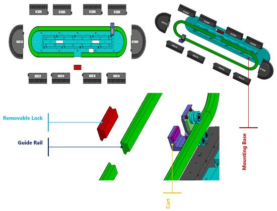 For the experimental setup, we use a closed loop track configuration, consisting of ten linear motor modules—eight straight modules and two 180-degree clothoid (curved) modules—as illustrated in Figure 1. Each straight module has a length of 250 mm, while each curved module spans 500 mm. This configuration results in a total track length of 3000 mm, enabling the carts to traverse a complete loop under varying test conditions. The track is divided into four main sections, each serving a specific purpose and contributing uniquely to the system’s dynamics.