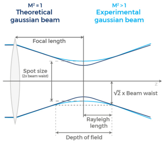 To address these limitations and ensure consistent damage results across various bearing components—comparable to those achieved in preliminary planar tests—an assessment of the allowable depth of focus was necessary. Specifically, by assuming a beam quality factor of 1.5 and a laser beam diameter (measured at intensity) of on the lens, the following calculations were performed: