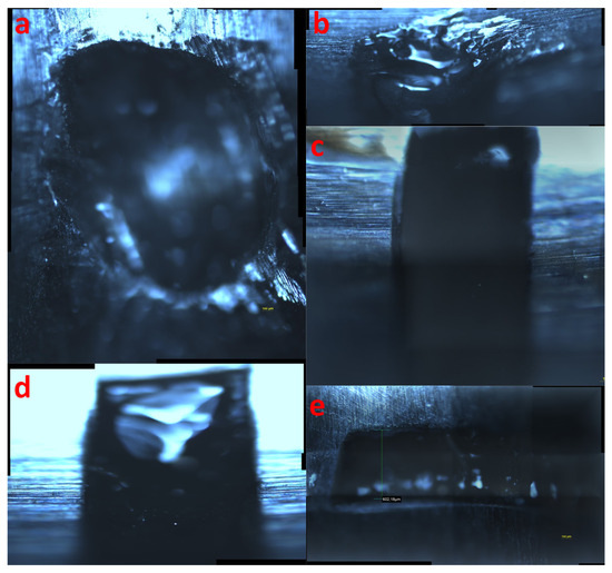 Microscopic view of bearing faults: (a) Incipient version IR fault of bottom bearing, (b) Incipient version OR fault of bottom bearing, (c) Lase version 0.5 OR fault of top bearing, (d) Lase version 1.0 OR fault of bottom bearing, (e) Lase version 0.5 IR fault of bottom bearing.