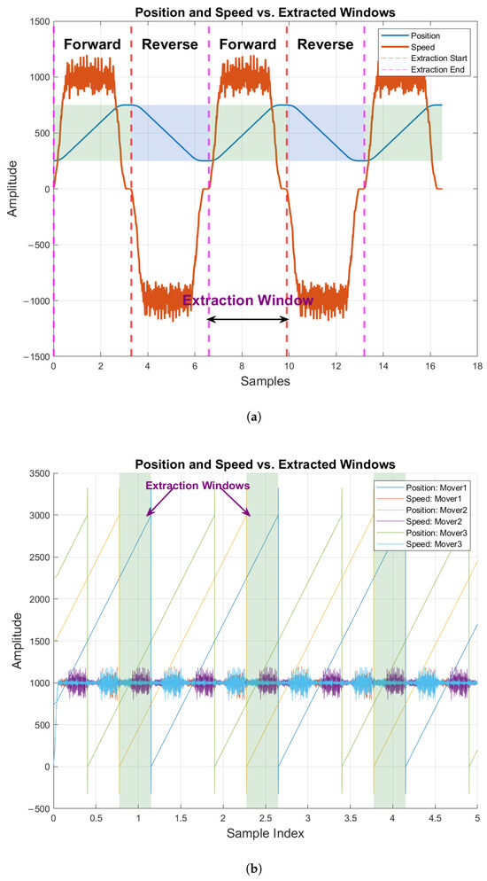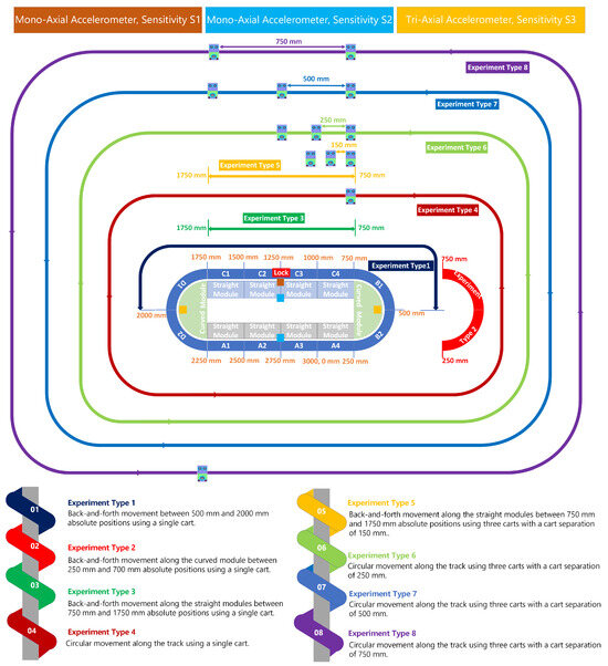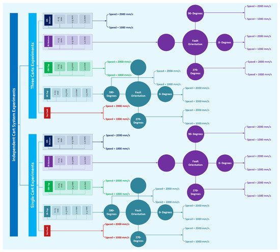 The data acquisition strategy was carefully designed to collect complete data sets from an independent cart transport system operating under a variety of fault conditions, speed profiles, and cart configurations. The experiments were organized into two main categories: single-cart and three-cart fleet experiments. Each category was further divided into four distinct experimental types, covering variations in fault locations, fault orientations, fault severities, motion patterns, and operating speeds. These experimental classifications aimed to comprehensively capture the dynamic behavior of the system in various operational scenarios as illustrated in Figure 7. This structured approach ensures that the data accurately represent the interplay of system variables and fault characteristics in different configurations. The data were acquired at two cart speeds: 1000 mm/s and 2000 mm/s. The speed of 1000 mm/s was defined as the minimum speed at which vibration signals become clearly observable and measurable. Below this threshold, the vibration signals were found to be too weak or inconsistent for reliable analysis. The speed of 2000 mm/s was chosen, as it represents half of the system’s maximum operational speed. This allows for a comparative analysis of how vibration signals change as the speed doubles, providing insights into the relationship between speed and vibration behavior. Both speeds are within the operational limits of the experimental setup, ensuring that the system can reliably achieve and maintain these speeds without compromising data quality or experimental integrity.