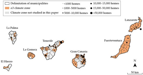 As established in Directive 2024/1275 [2], EU Member States should consider outdoor climatic conditions and local specificities to promote the improvement in the energy efficiency of buildings. For the particular case of Spain, the Spanish Government defines, in the Technical Building Code (TBC) [39], six winter climate zones, with the codification α, A, B, C, D, E, and four summer climate zones, numerically codified as 1, 2, 3, 4. The codes, in both cases, are ordered from lowest to highest winter and summer climate severity, respectively. In this way, the climatic characteristics of each territory in Spain are referenced by combining a winter code with a summer code. The Canary Islands are characterised by many areas with low winter and high summer climatic severity, specifically with climatic conditions type α3 (see Figure 2). The α3 climate zone corresponds to sites located at an altitude below 350 metres above sea level.