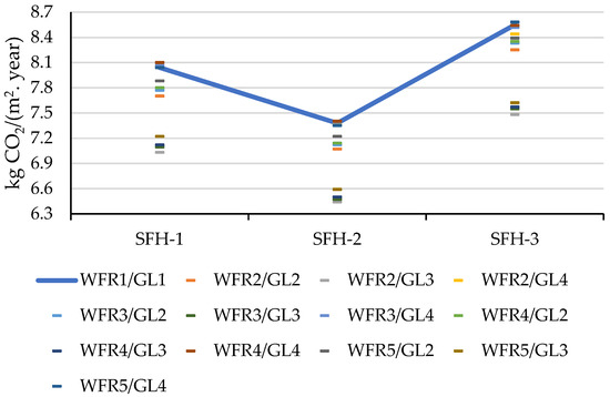 Figure 6 shows the results obtained for the specific impacts of cooling’s primary energy consumption on CO2 emissions. For all dwelling types, it is the WFR2/GL3 combination that minimises emissions. Compared to the base case (WFR1/GL1), for the SFH-1 dwelling type, emissions can be reduced by up to 12.6%, from 8.04 to 7.03 kg CO2/(m2·year). For the SFH-2 dwelling type, the maximum reduction observed is 12.7%, and the value of 7.38 kg CO2/(m2·year) obtained for the base case can be reduced to 6.44 kg CO2/(m2·year). Finally, for the SFH-3 dwelling type, the base case value of 8.55 kg CO2/(m2·year) can be reduced by 12.5% to 7.48 kg CO2/(m2·year).