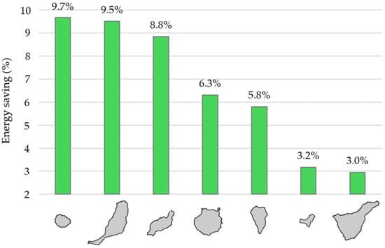 Our study shows that, in hot climate regions, the primary energy consumption for cooling is significantly sensitive to the shading systems installed in the window openings. For the case study, the implementation of the WSHA-5 system in residential buildings minimised cooling’s primary energy consumption in all cases. In this sense, an estimation of the overall energy savings in the residential building sector, differentiated for each of the study islands, was made for the particular case of the scenario in which the optimal shading system is implemented in the SFHs. Figure 9 shows the results obtained for each of the islands of the Canary archipelago. The current primary energy consumption in the residential sector was calculated based on the latest official data on energy consumption in the residential sector in the Canary Islands for 2022 [46]. In absolute terms, the islands of Gran Canaria, Tenerife, and Lanzarote have the highest energy reduction potential, while El Hierro has the lowest. This is mainly due to the fact that the former have the largest total surface area of SFHs in hot climate areas. In relative terms, energy savings of more than 9% can be achieved on the islands of La Gomera and Fuerteventura (see Figure 10).