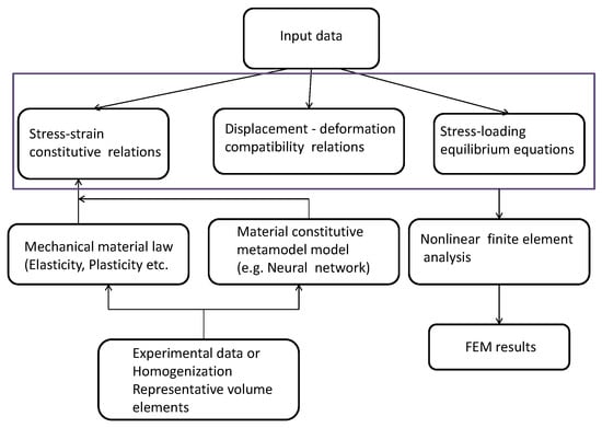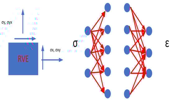 Using ANNs is able to simulate classical mechanical problems if sufficient samples of input–output data are provided for training. The concept is shown schematically in Figure 1 and Figure 2 ([1]) for the stress–strain relation of the RVE. The RVE for every possible complexity is solved for different combinations of stresses, and the corresponding strains are calculated and used for training. More refined approaches introduce additional physical restrictions on the corresponding constitutive metamodel so the thermomechanical principles are not violated [25]. Furthermore, loading sequences can be used in a path-dependent problem to train a corresponding neural network that will provide the response based on previous loading sequences at a given point.