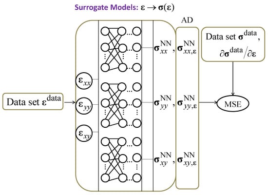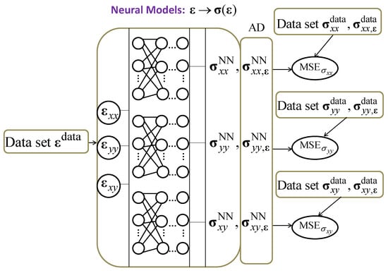 where are the output of the neural network, namely, the values of the stress tensor which are computed by the composed constitutive neural network of the variable data set , and N is the number of the values used for fitting the given data set for the stress tensor (samples). If the residuals for the surrogate models, are treated separately, i.e., there are three neural networks (Figure 5), then instead of (4), the following formulas yield