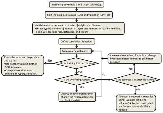 In this section, a computational algorithm for the construction of a neural network constitutive metamodel is presented. The procedure is implemented with the use of automatic differentiation of Tensorflow 2.14.0 and Keras library of Python [40]. To optimize weights and biases, Adam’s optimization algorithm is applied, and the training set is divided into batches. The flowchart summarizing the process of constructing a neural network is presented in Figure 6.