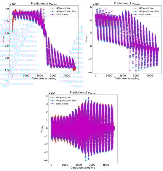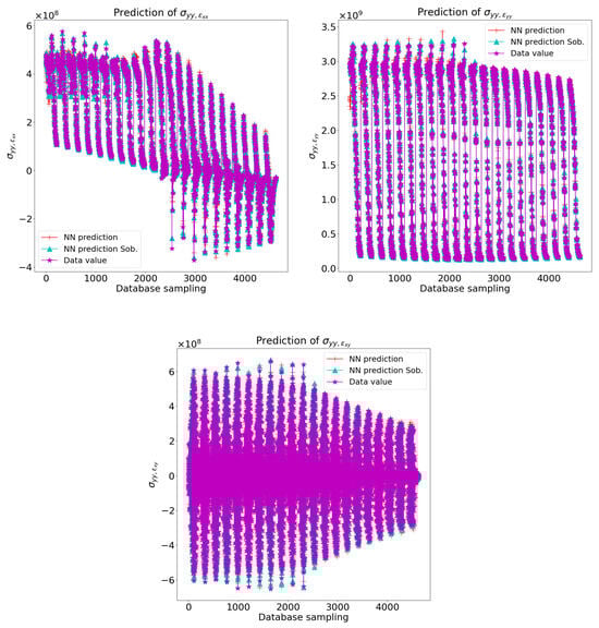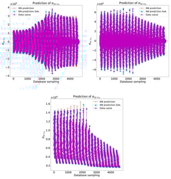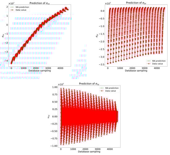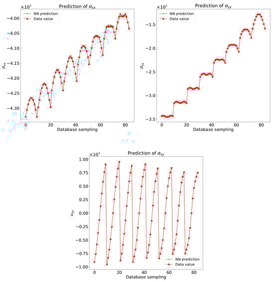 The components of the stress tensor after training of the neural network (Figure 5) and the data set (), obtained from the representative volume elements.