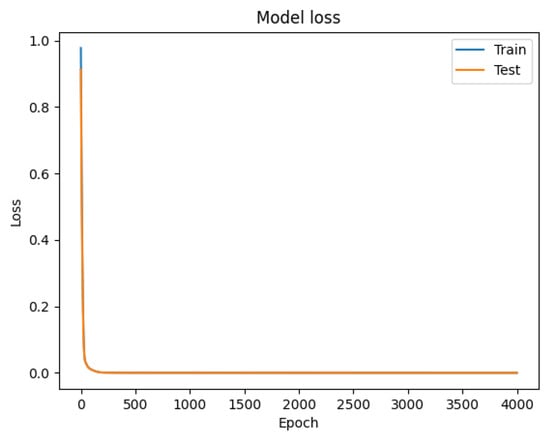 The time of computations can be decreased by using the three surrogate neural networks with the residual neural model, which includes the residual (4). The loss error function includes all three components of the stress function (Figure 4). This approach is less expensive, but it is effective only for computations of the stress tensor. Figure 8 shows the loss function (4) while training the neural network to calculate the components of the stress tensor. The number of epochs is 4000. The neural network as before has four hidden layers with [15, 20, 15, 20] neurons, respectively. The batch size is 64, and from the data set, we have taken the (42 for the training and 42 for the test validation) values of the stress tensor.