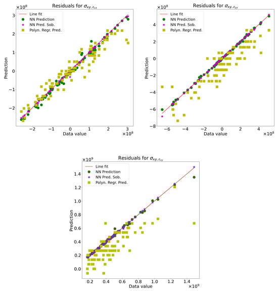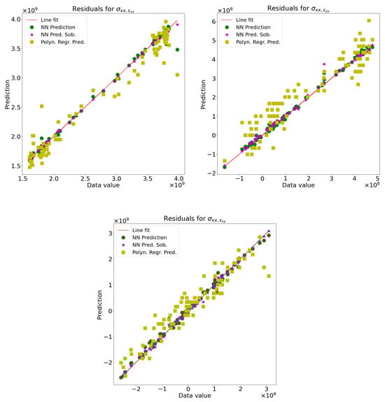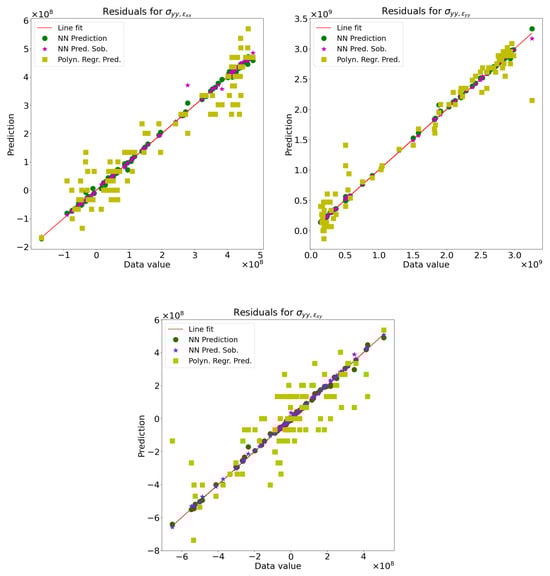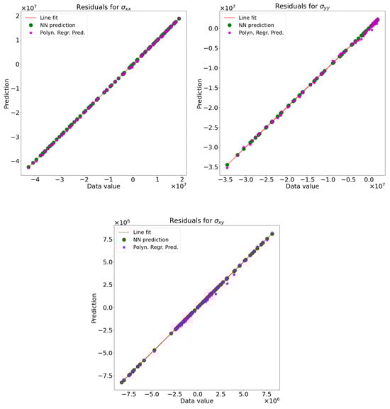 The line fitting for the components of the stress tensor after training the neural network and using the polynomial regression at the prediction points of the data set () obtained from the representative volume element.