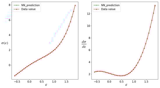 The stress–strain curve and the derivative of the stress at the predicted points with the exact values of the stress from Equation (14) are shown in Figure 17.