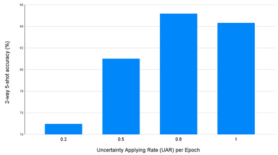 Next, in the learning process of the proposed UA-AML method, one can adjust the ratio of whether uncertainty is applied to the loss function or confidence in adjusting the gradients of the data using uncertainty. This ratio adjustment is made by replacing the uncertainty coefficient with confidence in the existing USB loss. Therefore, in this experiment, performance evaluation was performed by sequentially increasing the ratio of samples to which uncertainty is applied to 20%, 50%, 80%, and 100%. As shown in Figure 3, when the ratio selected as the hard sample was 20%, it showed the lowest performance. In contrast, when the ratio selected as the hard sample was 80%, it recorded 85.71% accuracy and showed the best performance. As a result of this experiment, it can be confirmed that the hard sample with high uncertainty has a positive effect on model learning, but the most positive learning effect appears only when the easy sample in an appropriate ratio is mixed. In addition, since these ratios may vary depending on the characteristics of each data or model, research on a methodology that can adaptively adjust the ratio is needed.