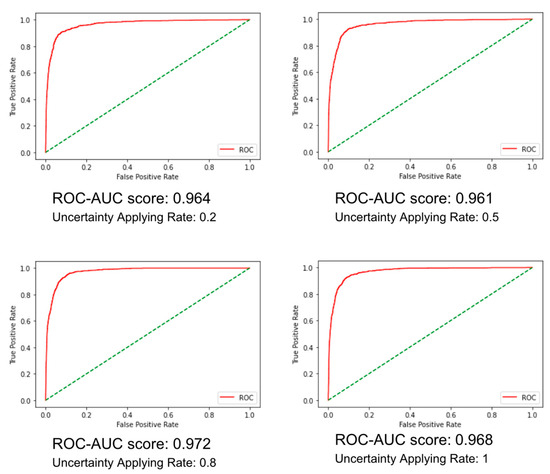 As shown in Figure 4, the Uncertainty Applying Rate (UAR) significantly impacted out-of-scope prediction. The best performance, with an ROC-AUC of 0.972, was recorded at an 80% UAR, reflecting an optimal balance between uncertainty estimation and prediction robustness. These results indicate that UA-AML SNGP effectively enhances out-of-scope intent detection while maintaining computational efficiency and robust uncertainty estimation. This makes it a compelling approach for practical applications where imbalanced and limited training data are common.