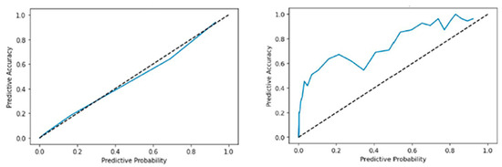 Uncertainty Calibration Plots by Uncertainty (UAR) Applying Rate per Epoch comparing SNGP (left) and UA-AML + SNGP with Uncertainty Applying Rate: 0.8 (right). The blue line represents the model’s actual predictive accuracy at each predicted probability level, while the dashed black line indicates perfect calibration.
