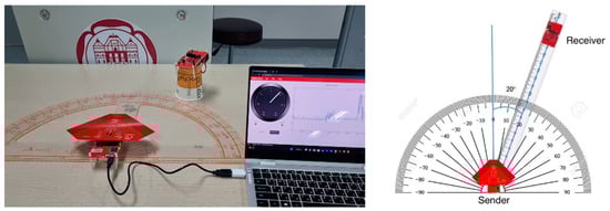 To collect the training data, we utilized the BOOSTXL-AOA kit [] from Texas Instruments [], as shown in Figure 1. The experimental setup involved securing the sender at a fixed location while rotating the receiver around it to collect data at precise distances, ensuring accurate angle measurements. The data collection was conducted indoors utilizing six antennas organized into two groups of three. Signals were gathered at 10-degree intervals, ranging from −90 to 90 degrees, with a signal interval of 625 μs. A Jetson Nano [] was used for data acquisition, producing CSV files that included RSSI values, phase drift values (pa1 and pa2), and the corresponding AoA results. Each angle was measured approximately 20,000 times to ensure reliability.