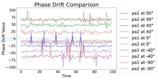The phase drift values exhibited consistent patterns over time, indicating a strong correlation between them. As shown in Figure 2, when analyzing the phase drift values at a fixed angle (e.g., 90 degrees) over 100 time steps (each time step is 625 µs), although overall patterns are unstable, both phase drift values demonstrated similar trends. This correlation suggests that phase drift values are influenced by similar underlying factors. Consistent patterns highlight that the phase drift values are not random but have an underlying systematic behavior. The variations in phase drift values are likely due to the same environmental factors, such as multipath propagation, delay, reflection, fading, and refraction, which consistently affect the phase of the signals. The correlation between phase drift values indicates their potential to be effectively used together to improve the accuracy of angle estimation.