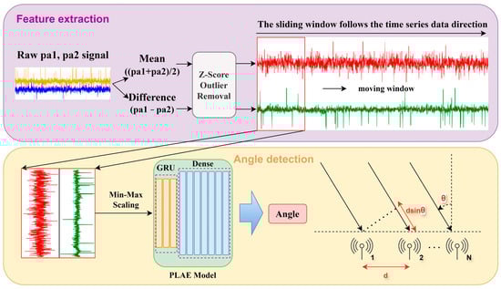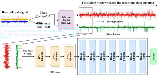 Data preprocessing involved several essential steps to ensure the dataset’s quality and suitability for training the regression model. Firstly, the phase drift values were processed to extract their means and differentiations. The mean values were calculated as (pa1 + pa2)/2, and the difference values were calculated as pa1 − pa2. As shown in Figure 6, the overall system overview of the PLAE model illustrates the processing of raw phase drift value signals through feature extraction and subsequent angle detection. This includes calculating the mean and difference values, performing Z-score outlier removal, and preparing the data for the model’s input layer. In Figure 6, the workflow of time series signal processing is further detailed, showing the structured sequences of 100 time steps using a sliding window approach, followed by min–max scaling and feeding into the model architecture, which comprises GRU and dense layers. This approach captures temporal dependencies and organizes the data for time series analysis.