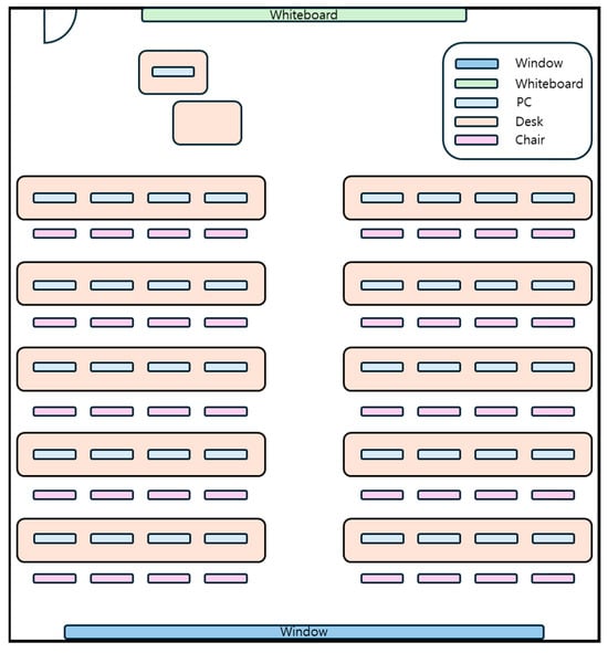 Figure 8 shows the university classroom where the experiments were conducted. The room measuring 201.36 m2 contains 40 desks with PC. The room layout included rows of desks and chairs, which could act as minor obstructions, while the walls, whiteboard, and glass windows introduced reflective surfaces that could cause multipath propagation.