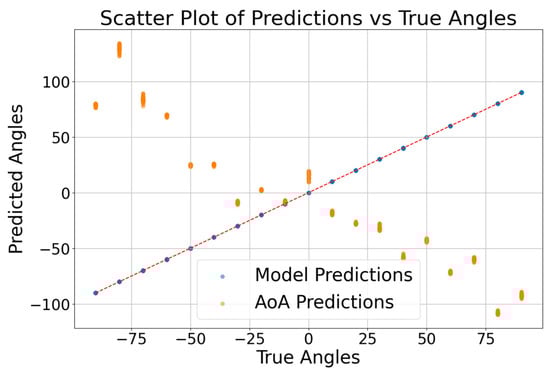 As shown in Figure 10, the relationship between the predicted and true angles for the test samples is illustrated, with the x-axis representing the true angles (degrees) and the y-axis representing the predicted angles (degrees). The blue dots represent the PLAE model predictions, while the orange dots represent the AoA predictions. The red dashed line indicates the ideal scenario where the predicted angles match the true angles. This visualization helps to assess how closely the model’s predictions align with the actual angles, highlighting the model’s accuracy in direction estimation. The PLAE model demonstrated a mean absolute error (MAE) of 0.031, which is significantly lower than the AoA’s MAE of 96.12. The maximum deviation from the true angles was 6.77 degrees for the PLAE model, whereas the AoA exhibited a much larger maximum deviation of 216.42 degrees. These metrics suggest that the PLAE model provides more accurate and consistent angle predictions compared to the AoA.