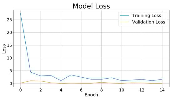 Figure 11 shows the evolution of the model loss during training and validation. The loss function used in this study is the mean squared error (MSE), which is defined as: