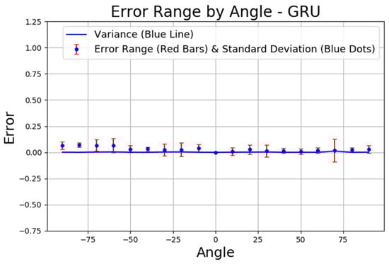 Figure 12 illustrates the error distribution by angle for the GRU layer model. The x-axis represents the angle (degrees), while the y-axis represents the error values. The blue line in the figure represents the variance, which reflects the overall spread of prediction errors across different angles. The blue dots indicate the standard deviation at each angle, showing the typical amount of deviation from the mean error. The red vertical bars illustrate the error range, extending above and below the mean error to visualize how much the prediction errors can vary. This representation provides a comprehensive view of both the average deviation and the overall error distribution across angles. The results indicate that the error values are consistently low and stable across most angles, with minimal fluctuations. The variance remains close to zero, and the standard deviation is also low, suggesting that the GRU model provides reliable and consistent predictions across different angles without significant deviations or spikes.