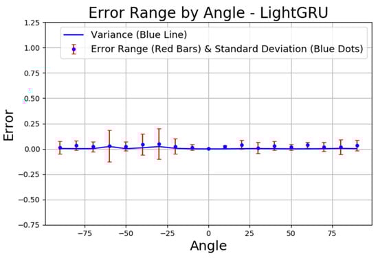 In Figure 13, the SGRU layer model’s error distribution by angle shows more variability compared to the GRU layer model shown in Figure 12. The standard deviation is significantly larger in multiple angular regions, particularly around ±75°, ±25°, and near 0°. Additionally, the variance, represented by the blue line, shows multiple spikes throughout the angle spectrum. This suggests that the SGRU layer model’s performance is less stable overall, with more pronounced prediction errors at various angles. One potential reason for this behavior is the impact of multipath reflections in the indoor environment. The experimental setup includes multiple desks, chairs, walls, and a whiteboard, which can cause signal reflections and diffractions, introducing phase distortions at specific angles. Notably, the regions around ±75° and ±25° are more exposed to these environmental structures, likely increasing signal interference effects. Since the same dataset was used for training all models, the higher variability observed in SGRU indicates that it is more sensitive to such variations compared to GRU and LightGRU. The SGRU model’s simpler architecture may have led to a weaker generalization of these complex indoor conditions, resulting in inconsistent phase drift estimations and larger errors in certain angles. However, no external Wi-Fi or Bluetooth interference was present during the experiment, confirming that the error variations are primarily due to the indoor environment and model-specific processing differences. Figure 14 displays the LightGRU layer model’s error range by angle, which demonstrates a more consistent error pattern across angles, similar to the GRU layer model in Figure 12. The standard deviation remains low for most angles, indicating reliable predictions. The variance is also minimal, suggesting that the LightGRU layer model performs well in maintaining consistent accuracy across different angles.