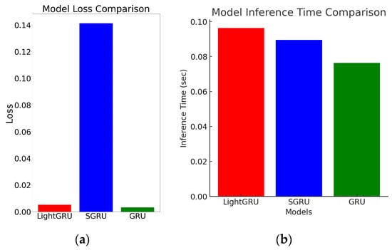 Comparative analysis of SGRU, GRU, and LightGRU layer models: (a) model loss comparison and (b) model inference time comparison.
