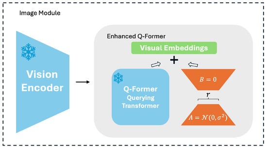 Owing to the combination of LoRA technology and the Q-Former module, both the efficiency and performance of BLIP-2 were significantly enhanced. This model is particularly suitable for highly resource-intensive applications, and it can provide outstanding results while reducing the computational cost [20,21]. Q-Former selectively processes only the most relevant information, while LoRA reduces the number of trainable parameters, decreasing the overall computational demand. Consequently, BLIP-2 can perform a wide range of vision-language tasks quickly and effectively, making it highly suitable for resource-limited environments [13,22].