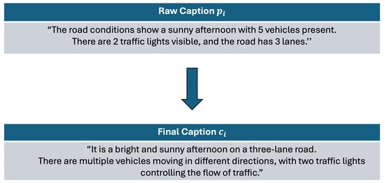 During the data generation process, questions such as “Describe the current road conditions including weather, time of day, and visible objects (road, vehicles, traffic lights) along with their counts” are used to generate complete natural language sentences, effectively addressing data scarcity and supporting the creation of captions suitable for autonomous driving scenarios. The structured input information used for raw caption generation, including the scene type, weather, and object details, is summarized in Table 1, while Figure 2 presents an example of how these raw captions are refined into final, human-like descriptions.